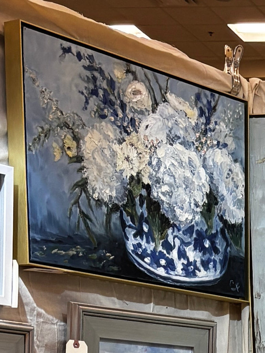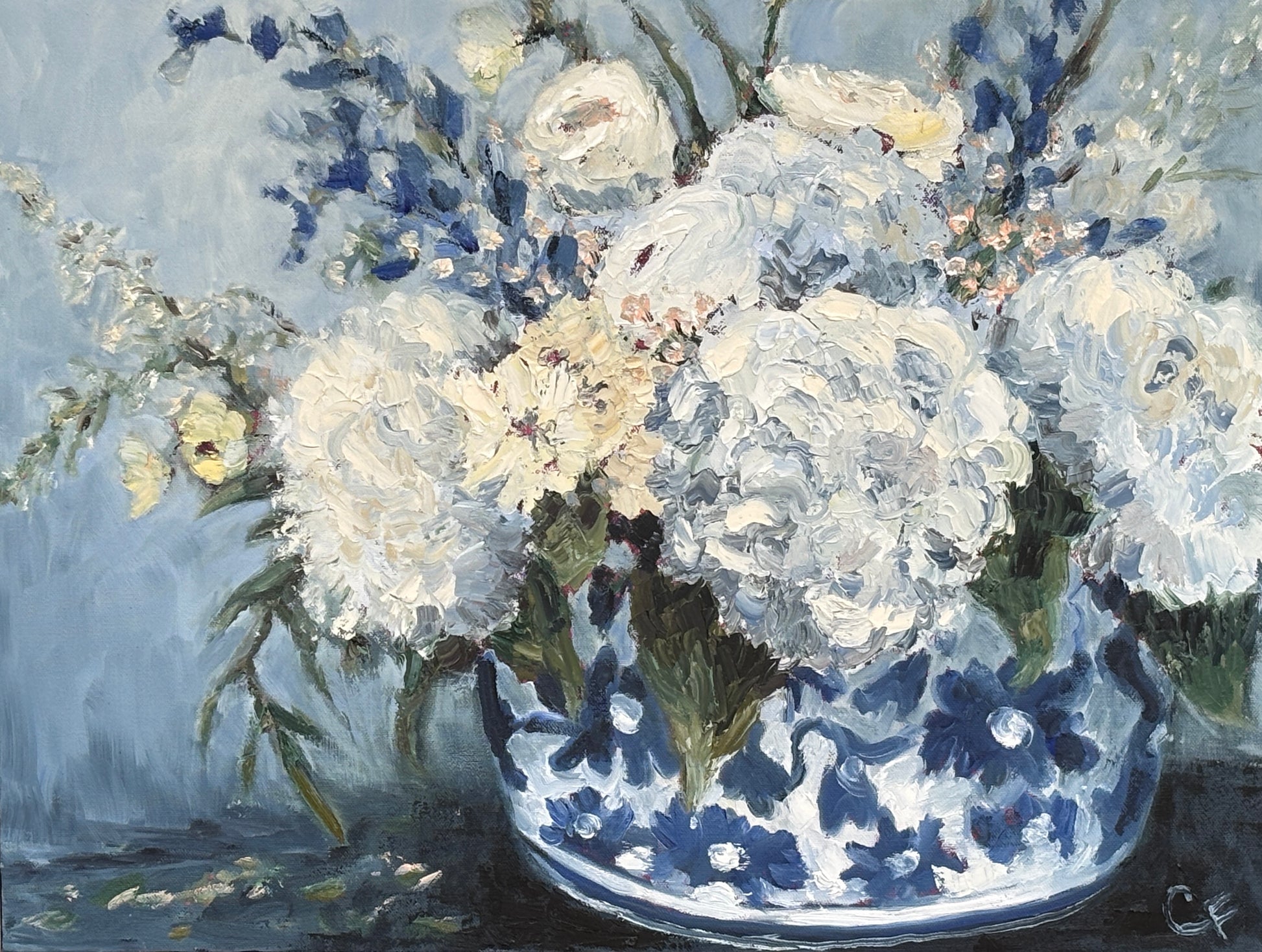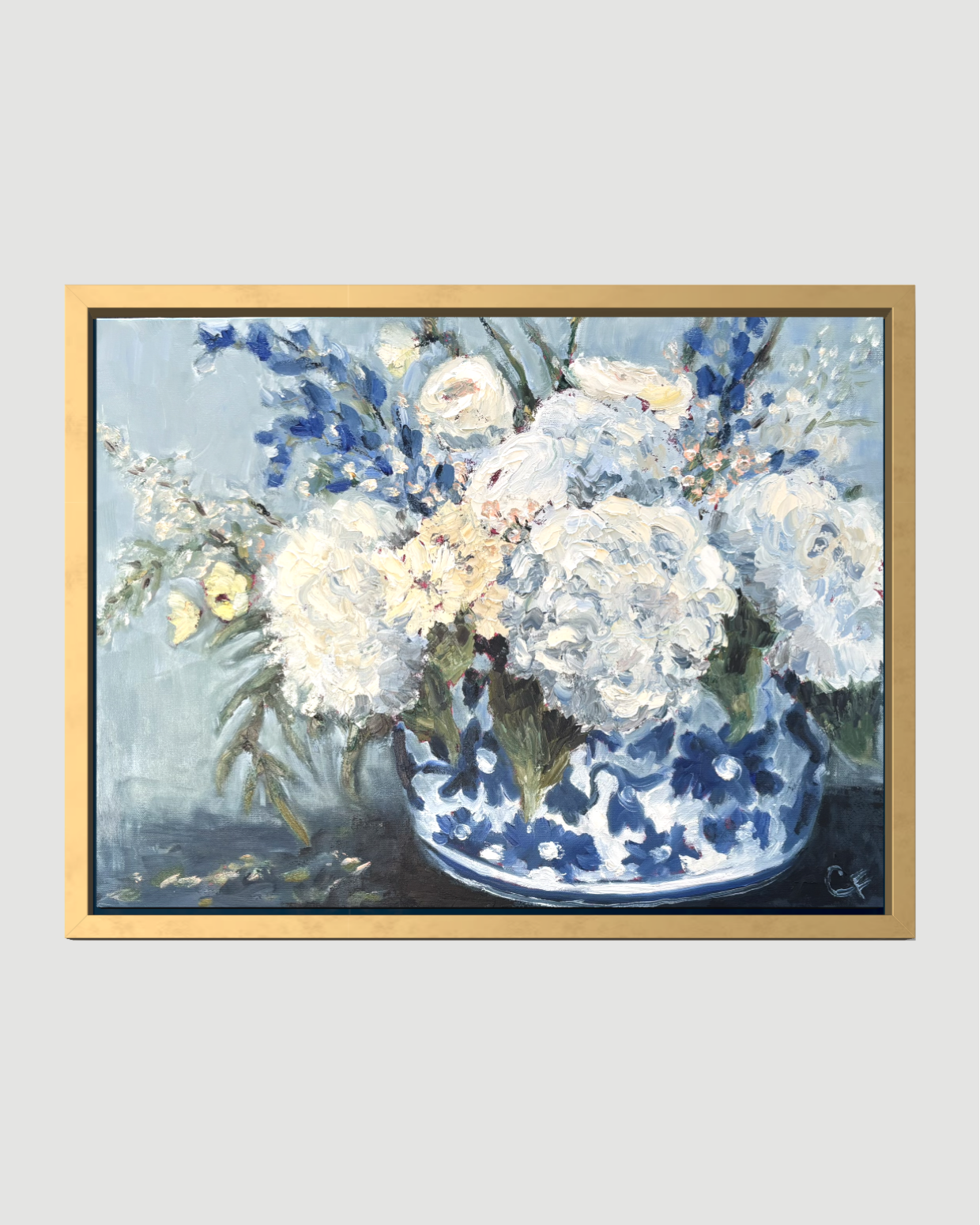 Stunning blue and white hydrangea floral arrangement fill this beautiful blue and white chinoiserie pot