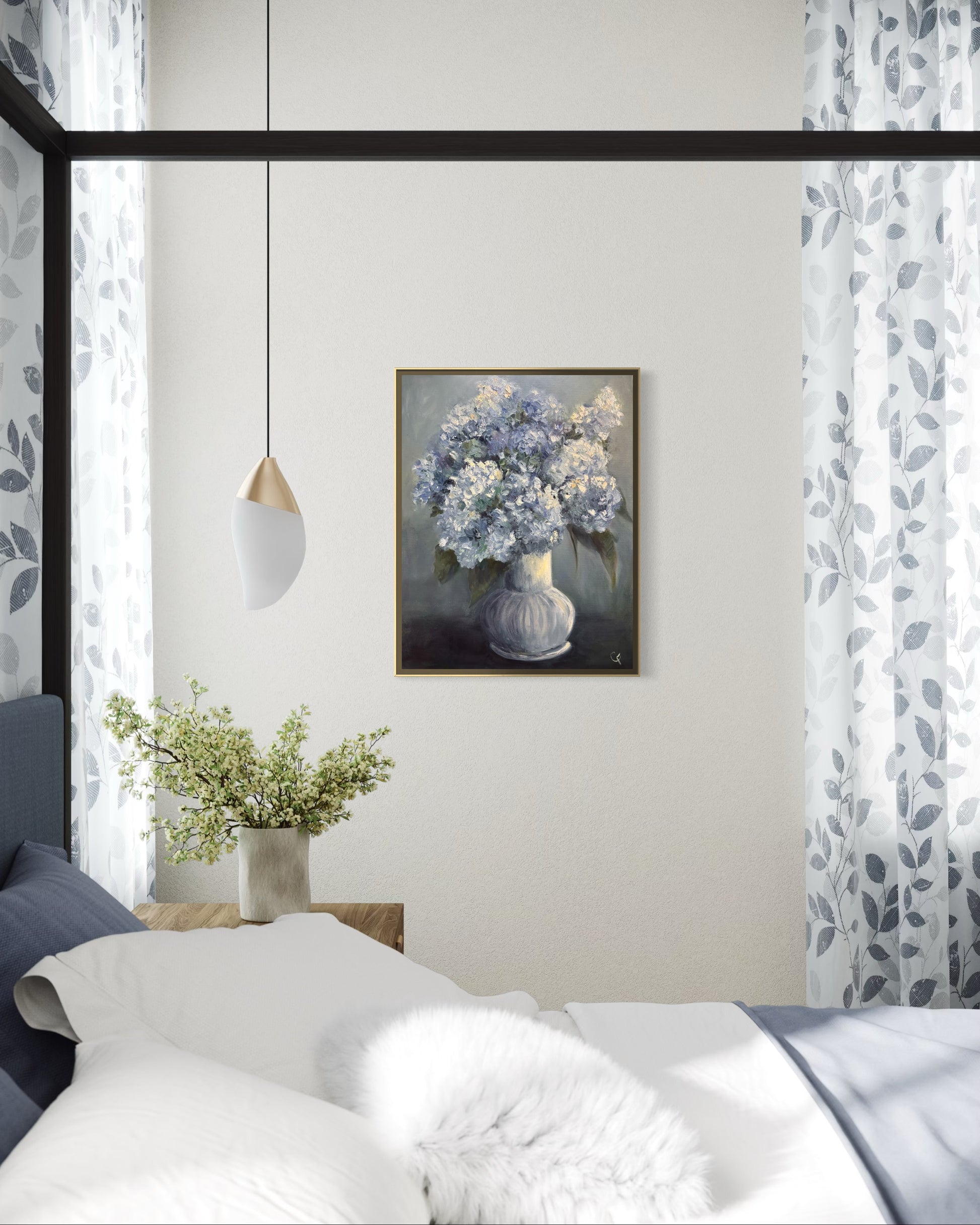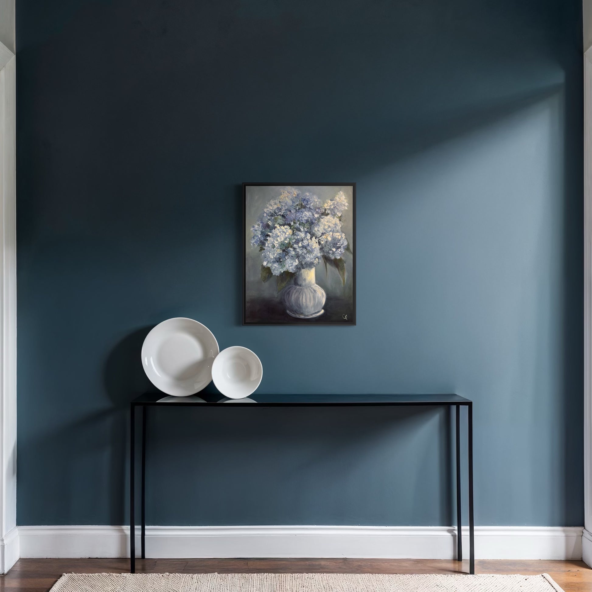 Classic blue hydrangeas with deep blue background add elegance to any space. Sides painted so not need to frame but can if desired. Frame not included.