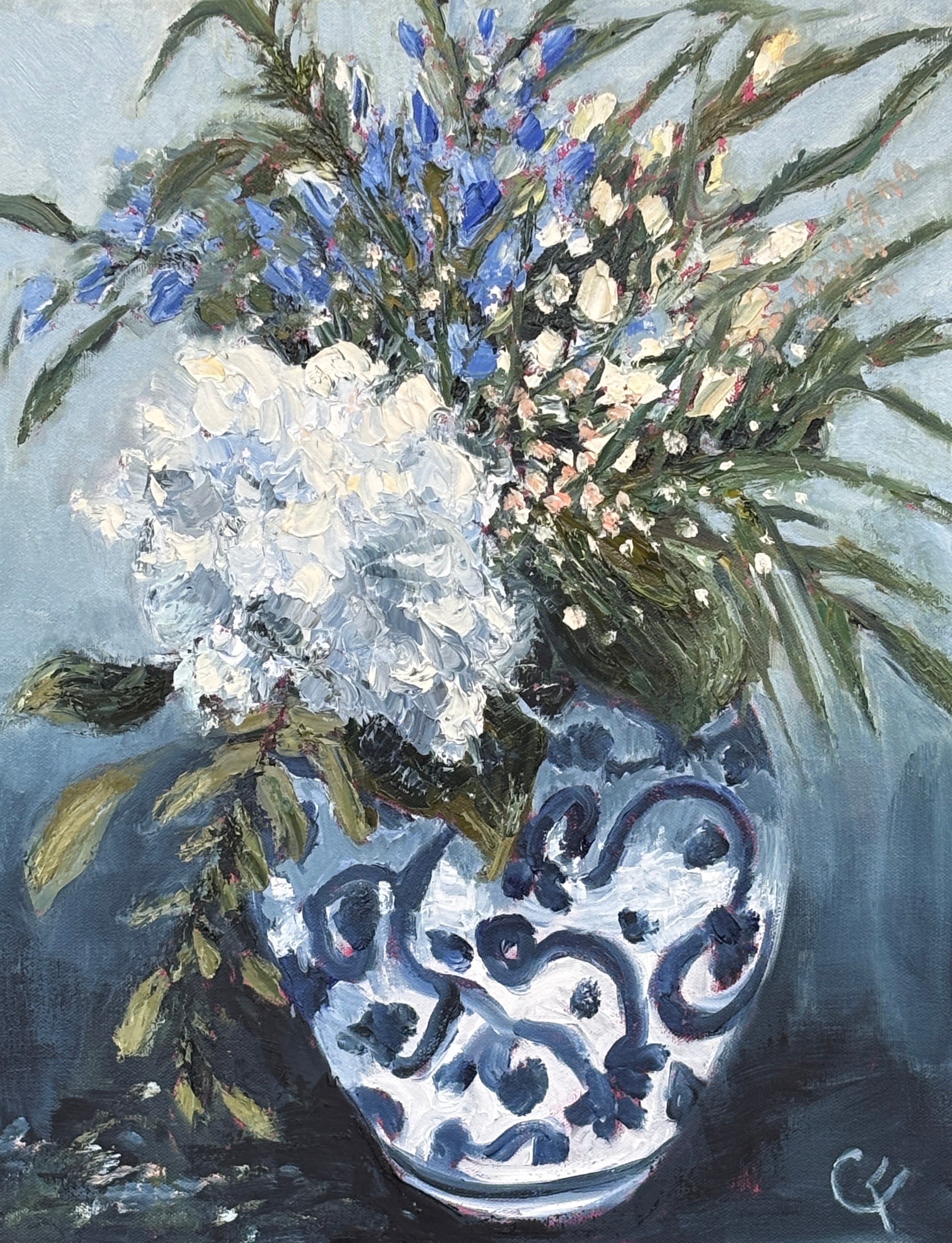 Gorgeous white hydrangeas and vibrant green leaves fill this beautiful blue and white chinoiserie vase.